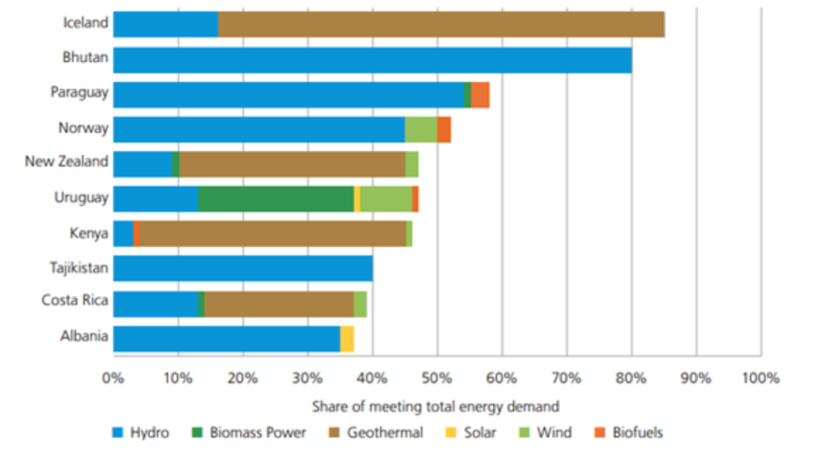 In 2024, Iceland and Bhutan led the world in meeting their country’s energy demand with renewable energy contributions. Wind and solar account for 15 percent of global power generation, a 2 percent increase from 2023. [Energy Institute]
