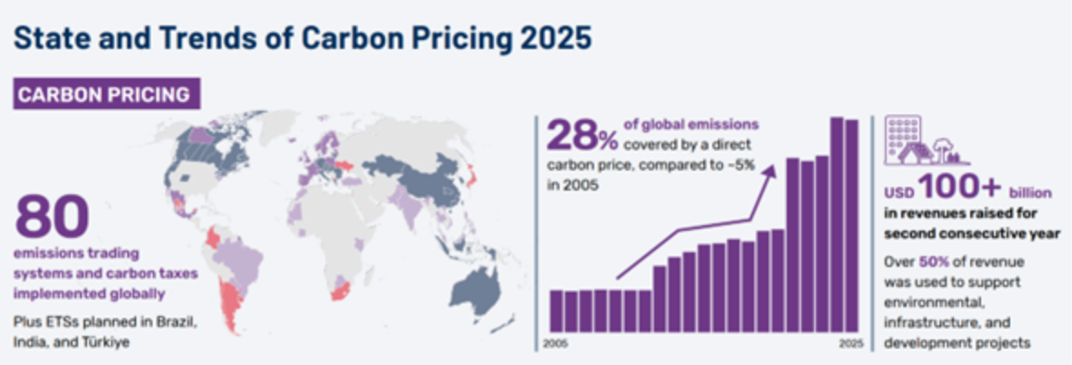 Globally, 28 percent of emissions are now covered by direct carbon pricing mechanisms, compared to just 5 percent in 2005, with major economies such as Brazil, India, and Turkey implementing emissions trading systems (ETS). For the second consecutive year, carbon pricing mechanisms generated over $100 billion in revenue, with the majority directed toward environmental, infrastructure, and development projects. [World Bank]