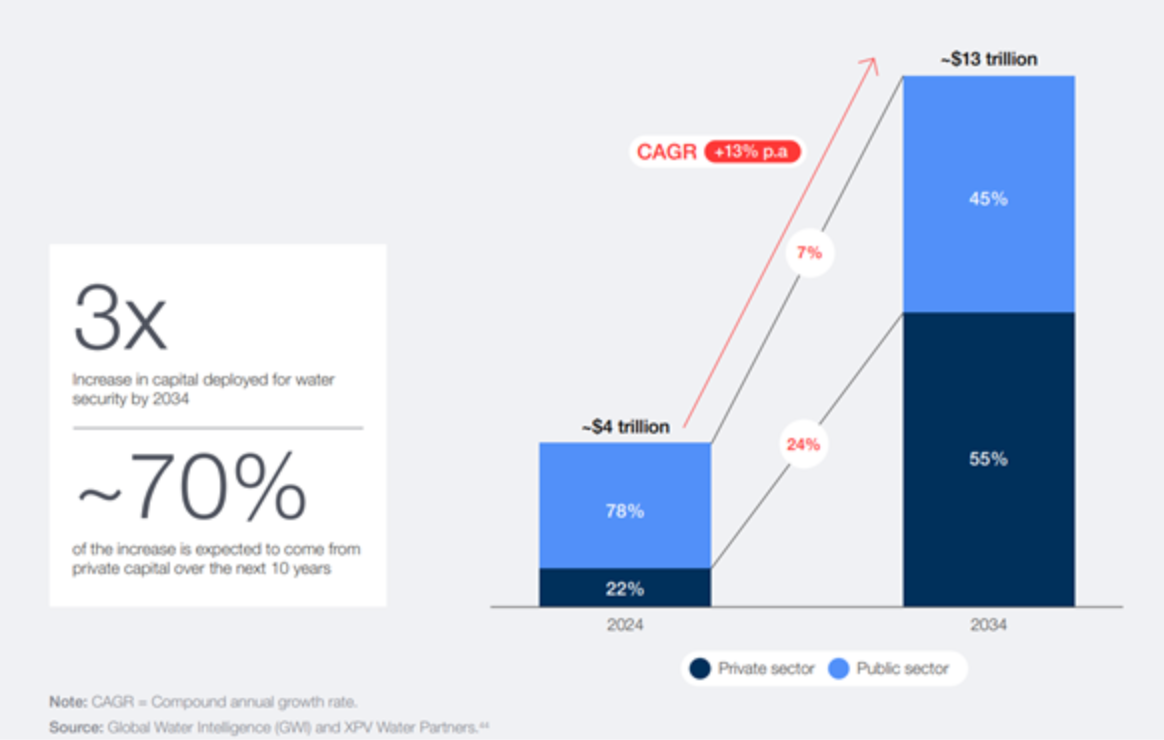 In the coming decade, private capital will surpass public capital in becoming the driving source for water security funding with total capital deployed amongst private and public sources expected to increase from $4 trillion in 2024 to 13 trillion in 2034. Private capital is projected to constitute 55 percent of future funding by targeting opportunities in asset ownership, agriculture, technology, and impact financing. [World Economic Forum]