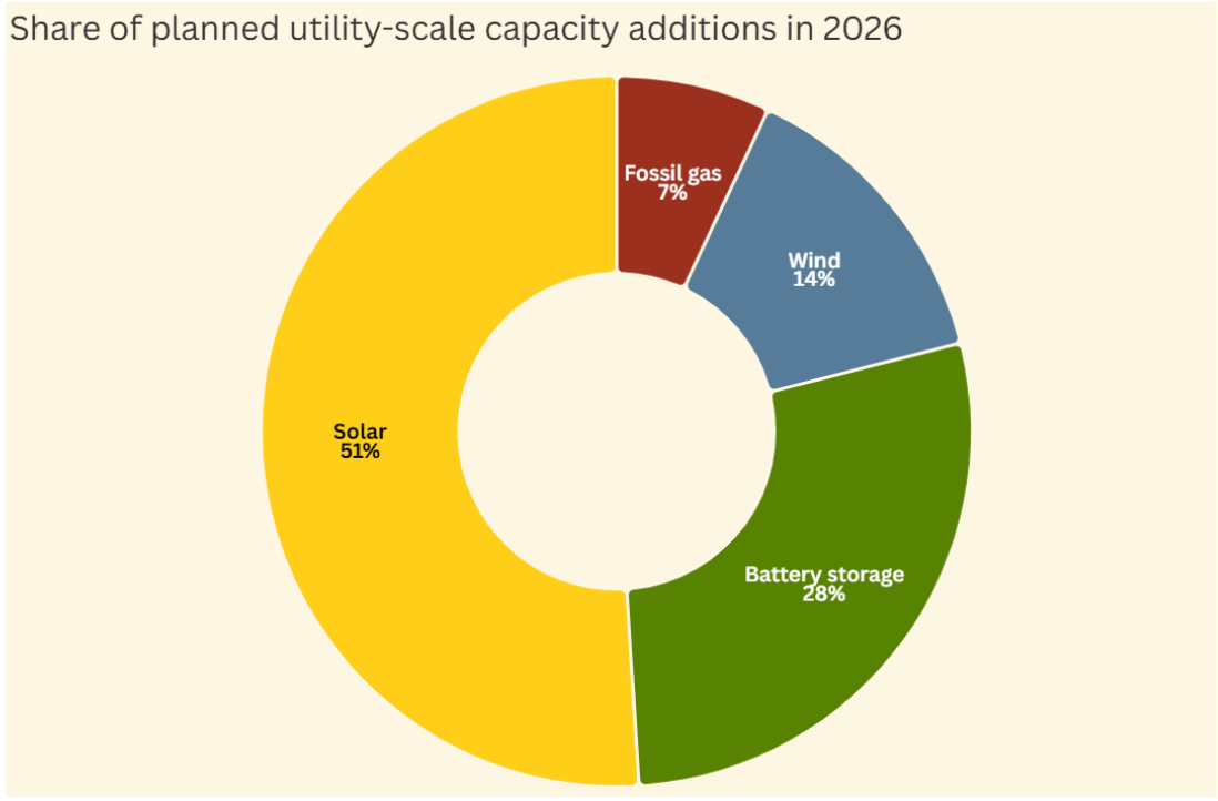 US energy developers are set to add a record 80 gigawatts of utility-scale solar, wind, and battery storage capacity in 2026—if fully realized, these additions will drive the largest annual increase in power capacity in US history. This year’s anticipated capacity additions follow a 2025 build-out of 53 gigawatts that was already the largest in over two decades, signaling an acceleration in power supply deployment.[Canary Media]