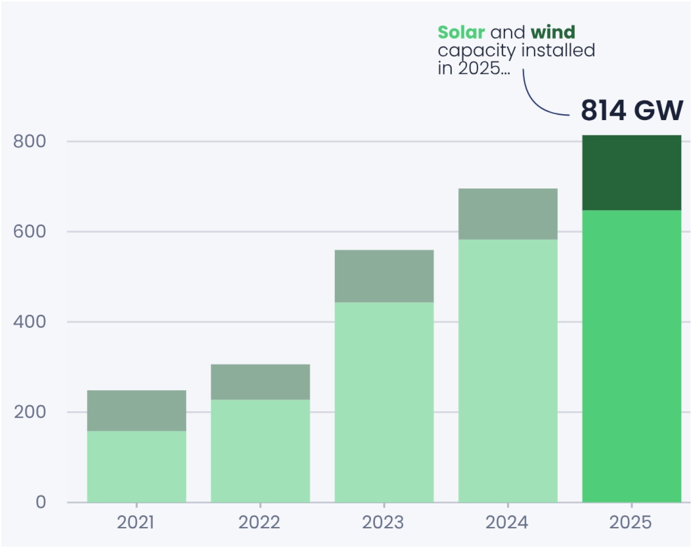Global solar and wind installations reached a record 814 gigawatts in 2025, a 17% year-over-year increase, bringing total capacity to over 4.17 terawatts. Analysis from energy think tank Ember reported that 2025 capacity additions alone could displace 15% of global natural gas supply, enough to save approximately $138 billion in annual fuel import costs. [Ember]