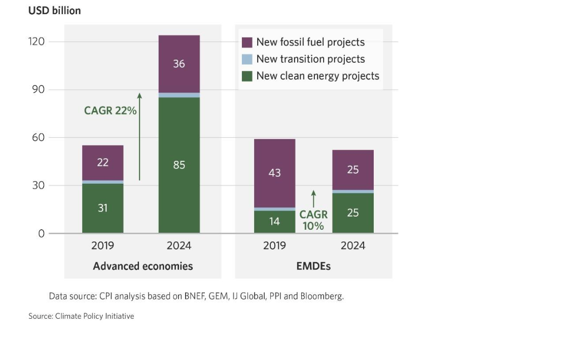 Direct new project finance for clean energy and transition projects grew more than 2x faster than new fossil fuel investment between 2019-2024, reaching $110 billion globally in 2024. During the same period, project finance for new fossil fuel projects in emerging markets and developing economies (EMDEs) decreased from $43 billion in 2019 to $25 billion in 2024, underscoring a global transition toward sustainable energy solutions and a pivot away from fossil fuels.[Climate Policy Initiative]