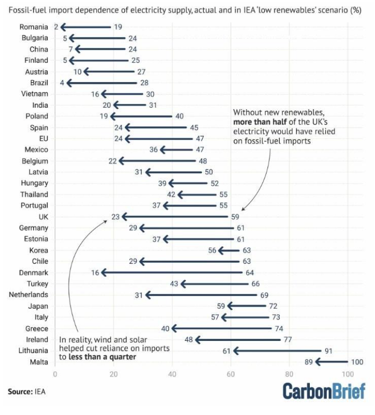 A CarbonBrief analysis of International Energy Agency (IEA) energy scenarios found that, compared to a low-renewables pathway, renewable energy investments have saved fossil fuel importing nations an estimated $1.3 trillion in avoided fossil fuel spending since 2010. Specifically, the UK, the Netherlands and Denmark led in their reductions to fuel import dependence by cutting over 30% through solar and wind supply developments. [Carbon Brief]
