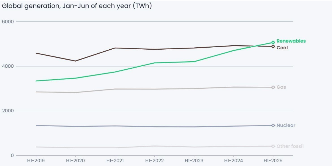 Renewables produced more electricity than coal for the first time on record in the first half of 2025