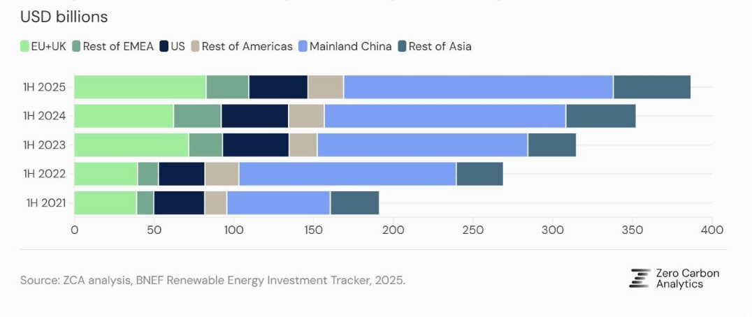 Renewable investments grew 10% in the first half of 2025 compared to the previous year, totaling $386 billion. TSignificant contributions to this growth came from major offshore wind investments in Poland and Taiwan and increasing solar spend in China. [Zero Carbon Analytics]